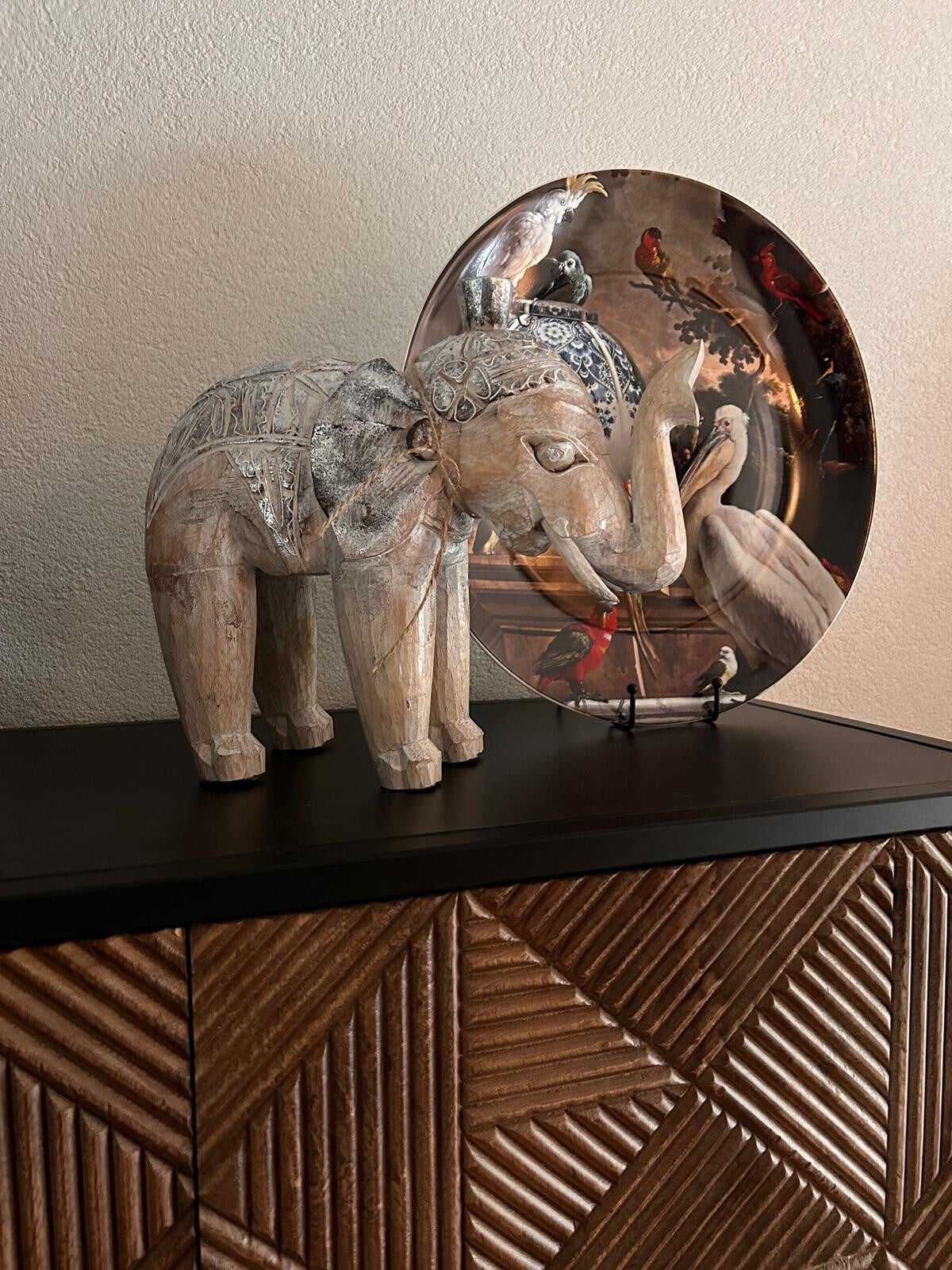 Breng een vleugje exotische charme in je interieur met dit prachtige houten olifantenbeeld, met de hand gesneden uit hoogwaardig hout. Elk detail is met zorg uitgewerkt, van de sierlijke slagtanden tot de fijne patronen in het lijf – een waar stukje vakmanschap.