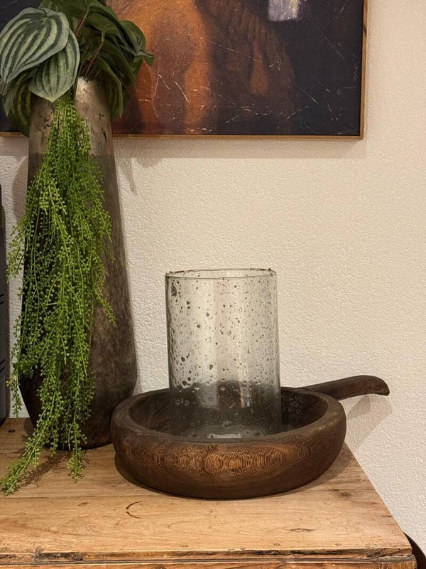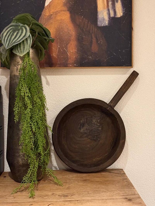 Deze prachtige houten schaal met handvat is met de hand vervaardigd in India. Het natuurlijke hout en de ambachtelijke afwerking geven elke schaal een uniek karakter. Perfect als decoratief item, serveerschaal of stijlvolle opberger in huis.