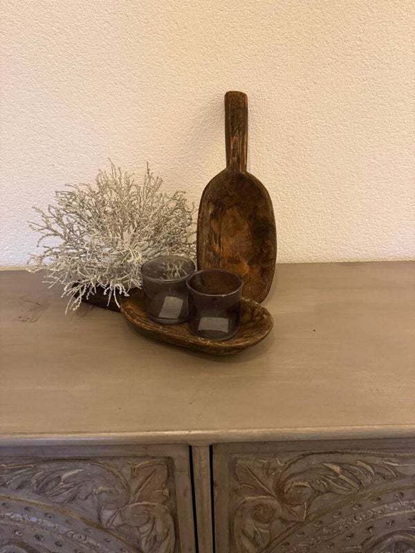 Elk stuk is uniek en vervaardigd van gerecycled hout met een natuurlijke afwerking. De schepvorm maakt het ideaal voor het serveren van noten, kruiden of kleine accessoires. Door het ambachtelijke karakter kunnen vorm, kleur en maat iets variëren.