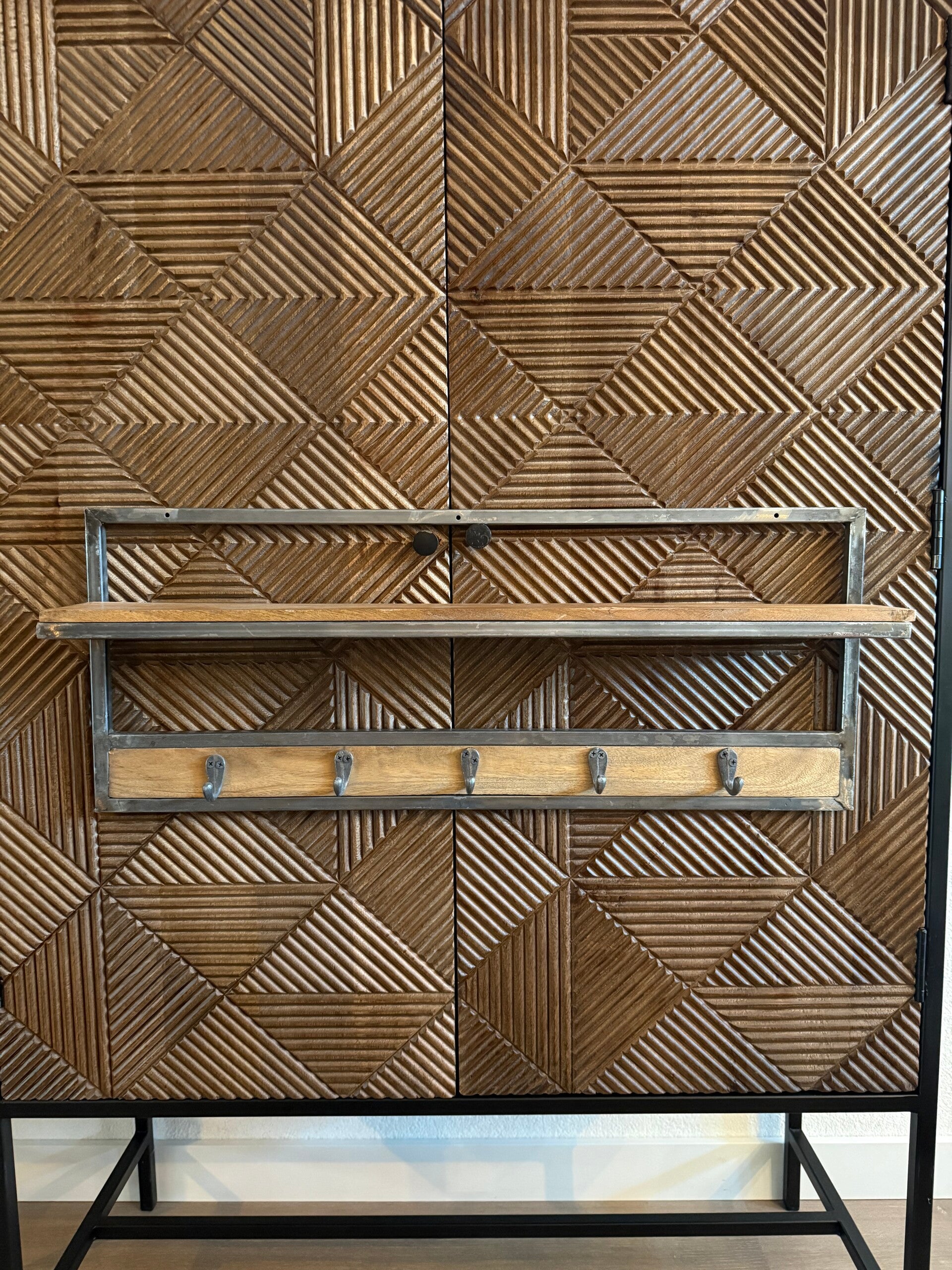 Breng sfeer en functionaliteit in je hal met deze landelijke kapstok van hout en metaal. De combinatie van warm hout en stoer metaal geeft deze kapstok een robuuste en tegelijk stijlvolle uitstraling die perfect past in een landelijk, industrieel of modern interieur.