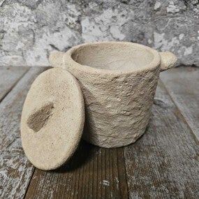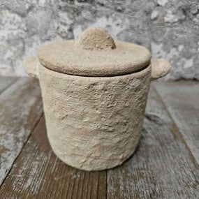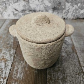 Mooie pot met deksel in een warme, landelijke stijl. Perfect voor liefhebbers van een rustiek en gezellig interieur. De pot straalt eenvoud en charme uit en past prachtig in een keuken, woonkamer of op een landelijke kast.